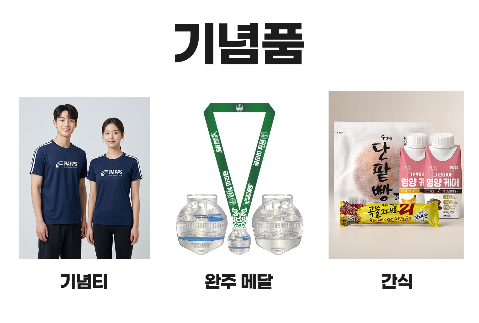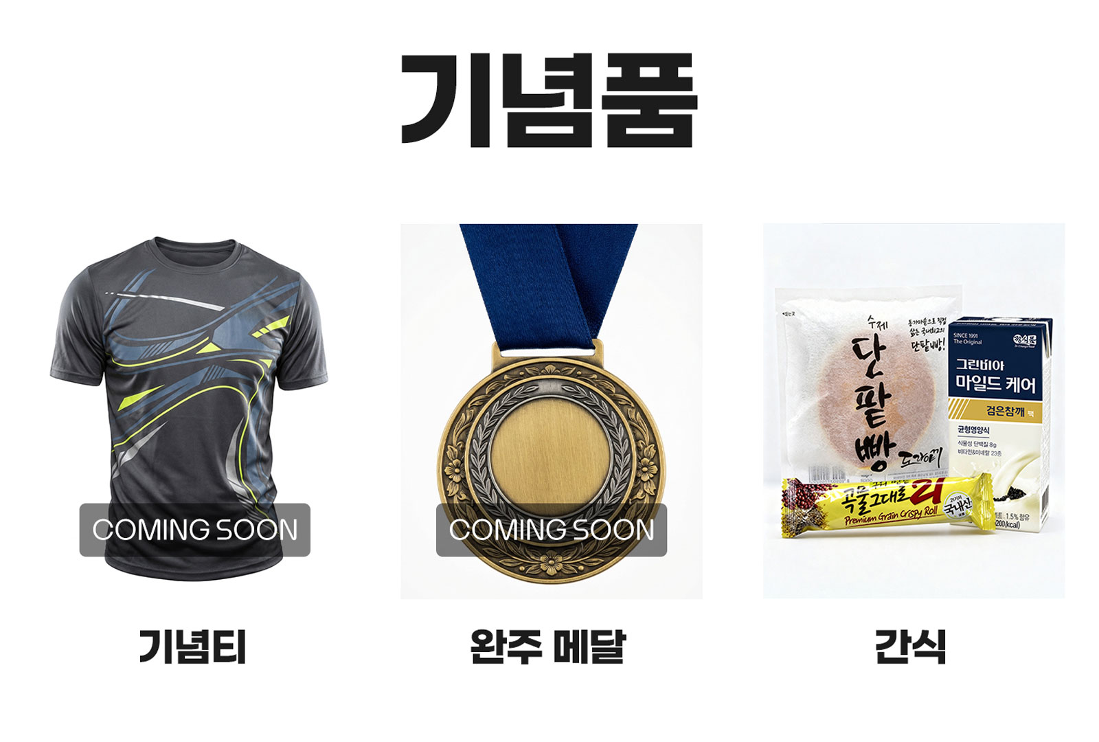 [ 기념품, 완주메달, 기록증(하프/10km/5km), 간식(빵,음료수) ]