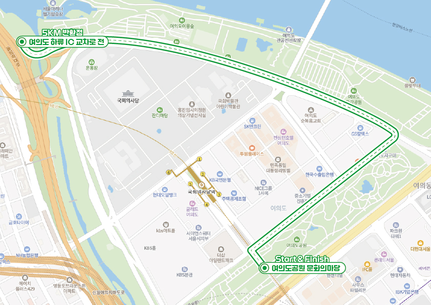 * 5km 코스 : 여의도공원 문화의 마당 → 물빛무대 앞 광장 → 여의도 한강공원 → 여의도이용숲 → 여의하류 IC 교차로 가기전 → 여의도이용숲 → 여의도 한강공원 → 물빛무대 앞 광장 → 여의도공원 문화의 마당