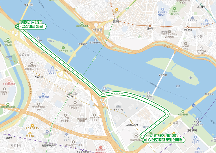 * 10km 코스 : 여의도공원 문화의 마당 → 물빛무대 앞 광장 → 여의도 한강공원 → 여의도이용숲 → 여의하류 IC 교차로 → 성산대교 인근 반환 → 여의하류 IC 교차로 → 여의도이용숲 → 여의도 한강공원 → 물빛무대 앞 광장 → 여의도공원 문화의 마당