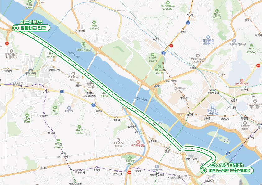 * 하프 코스 : 여의도공원 문화의 마당 → 물빛무대 앞 광장 → 여의도 한강공원 → 여의도이용숲 → 여의하류 IC 교차로 → 성산대교 → 방화대교 인근 반환 → 성산대교 → 여의하류 IC 교차로 → 여의도이용숲 → 여의도 한강공원 → 물빛무대 앞 광장 → 여의도공원 문화의 마당
